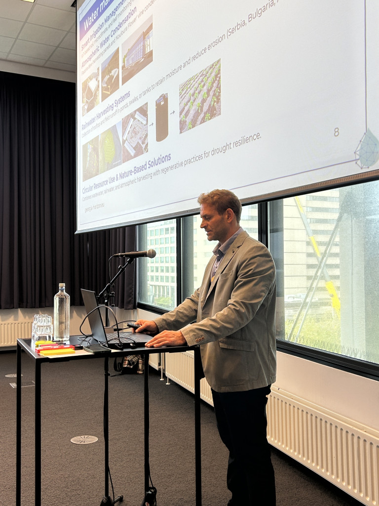 Shortly after, GEORGIA took the stage for its 3-minute pitch, delivered by Theodore Zahariadis, Project Coordinator (Synelixis Solutions S.A.). In just a few minutes, he captured the audience’s attention with GEORGIA’s vision: integrating water sensor networks, interoperable data frameworks, and stakeholder co-design to build climate-resilient agricultural systems.